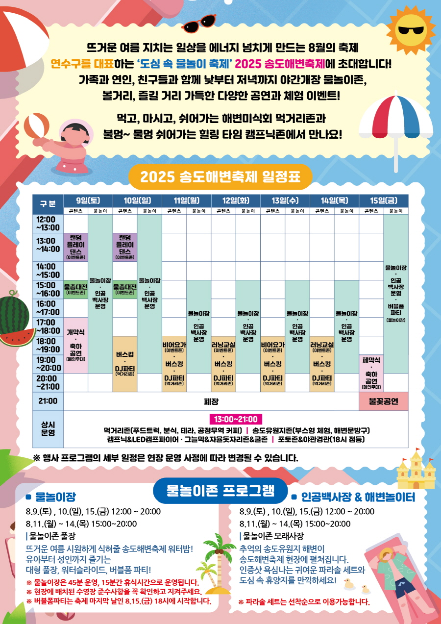 2025 송도해변축제가 오는 8월 9일부터 15일까지 인천 송도달빛공원 일대에서 화려하게 펼쳐집니다. 무더운 여름을 날려버릴 시원한 물놀이와 음악 공연, 다채로운 체험, 야경을 수놓는 불꽃놀이까지 한자리에서 즐길 수 있는 이 축제는 매년 수많은 인파가 찾는 인천의 대표 여름 이벤트입니다.